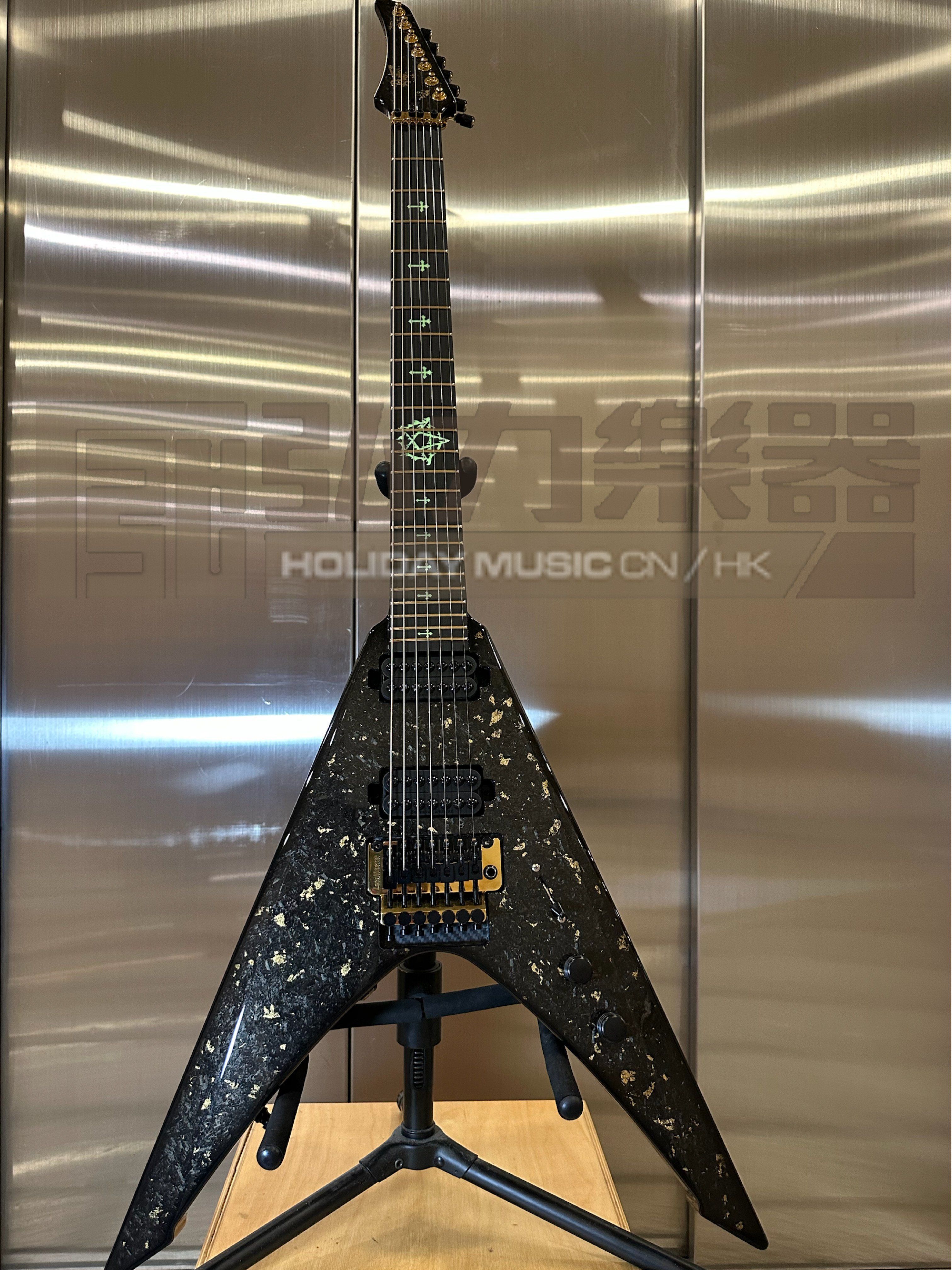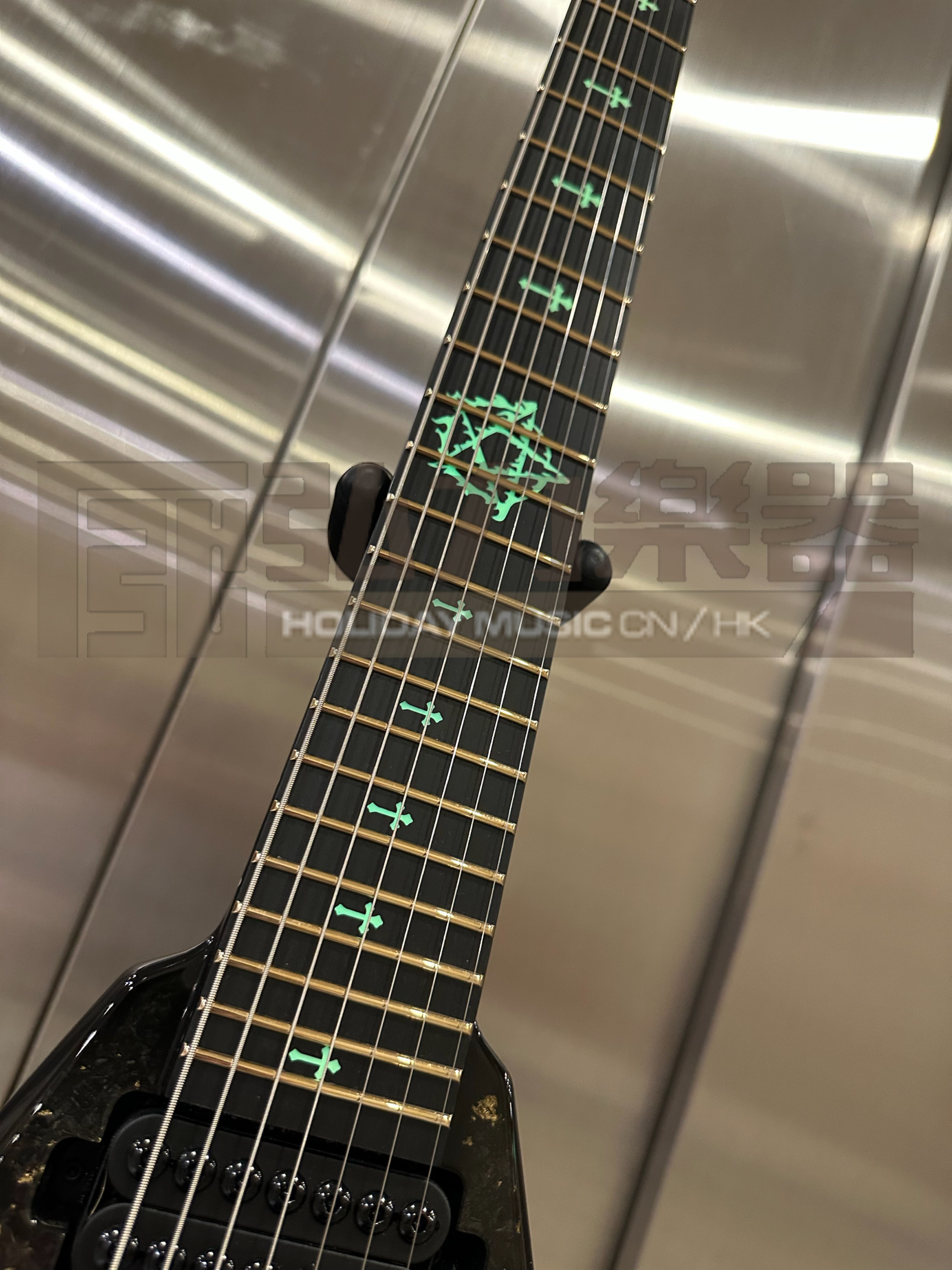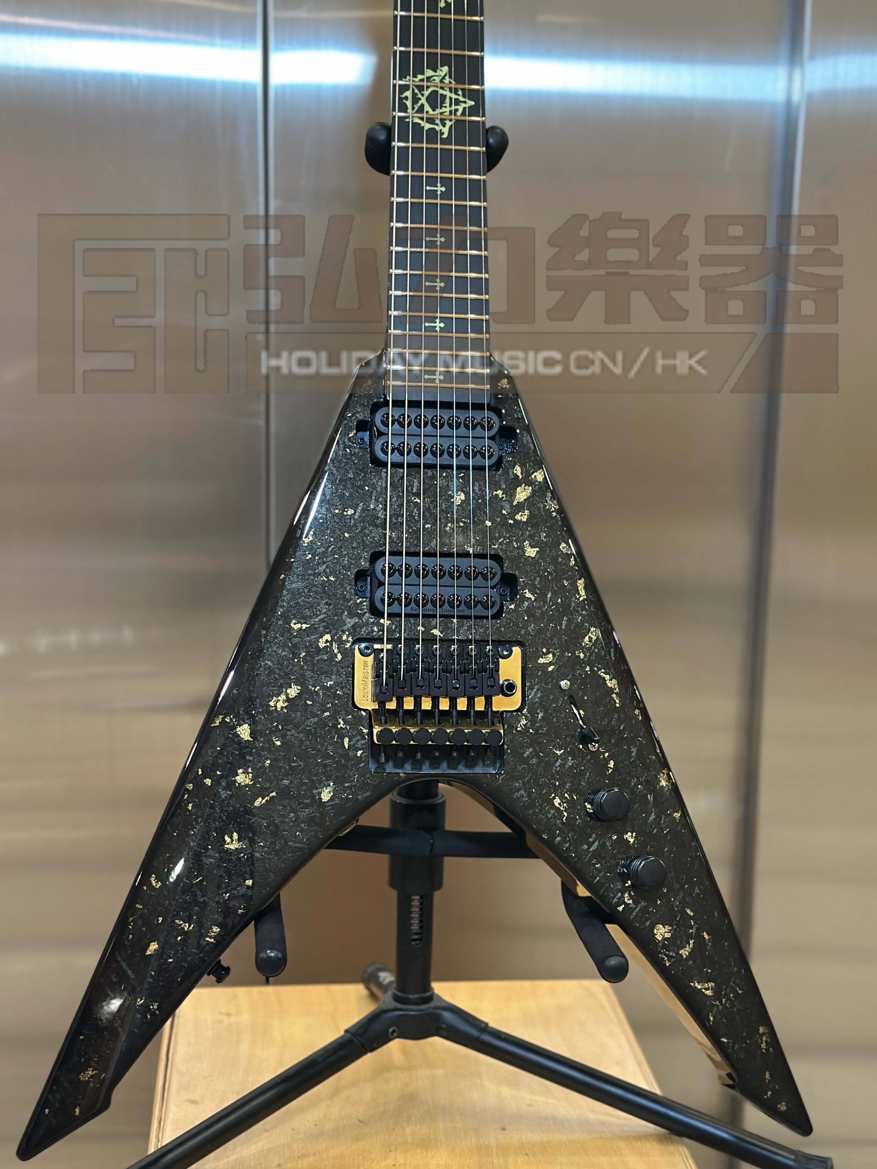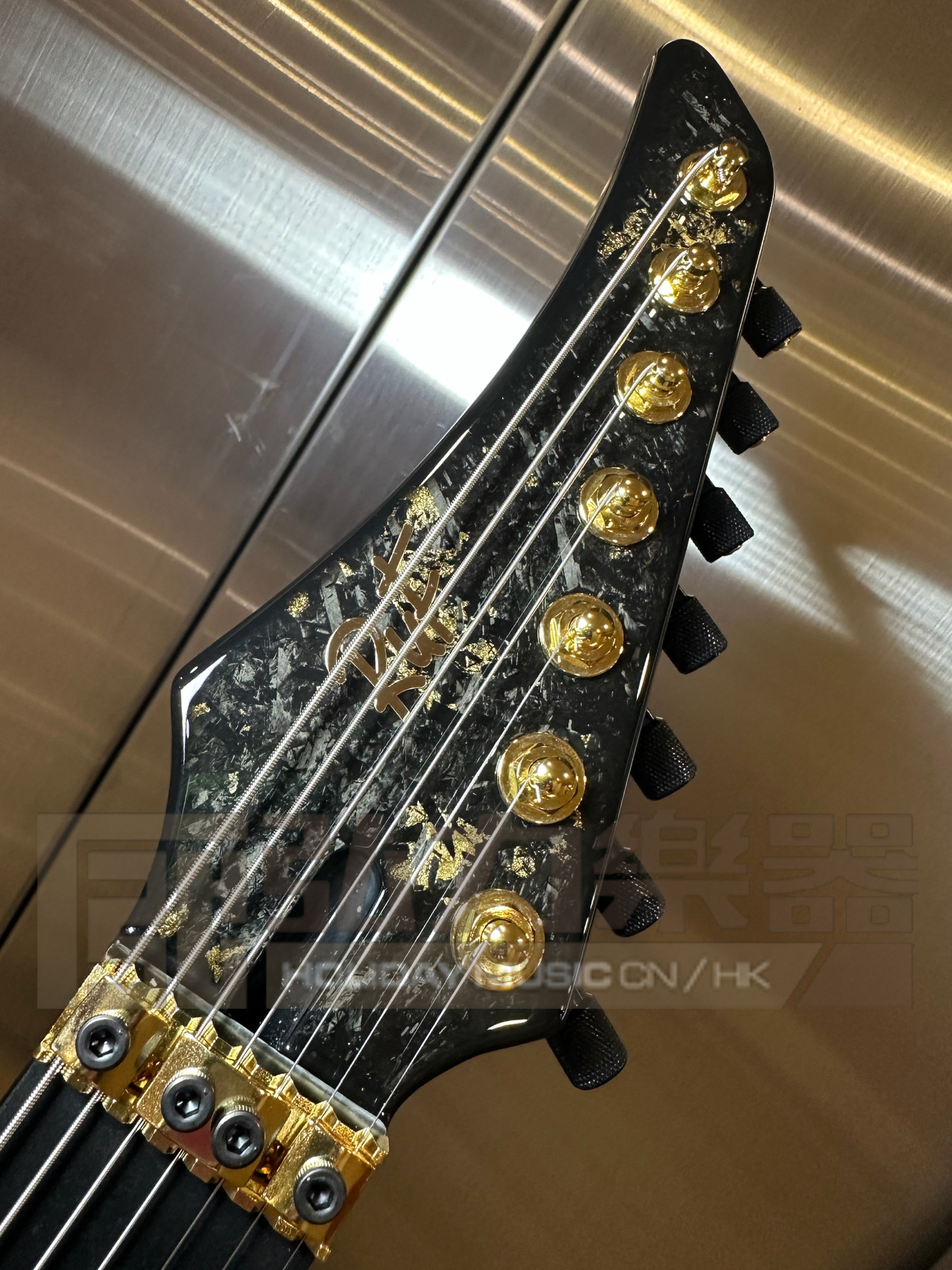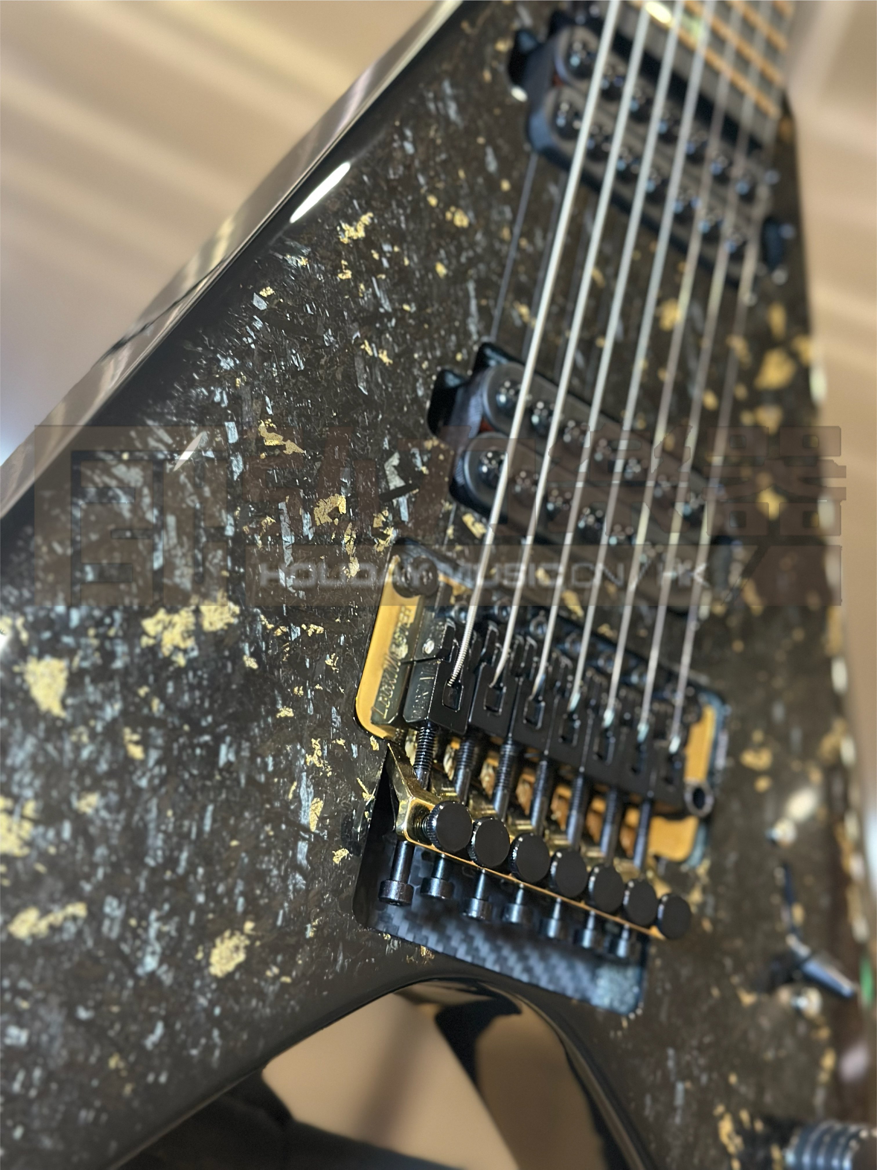Doctor Vinci 7 - Gloss Scale 26,5“ Entire specs in forged carbon with gold addition, backplate twill with gold burst Black Diamond Richlite Fretboard crosses with pentagram on 12th fret Side Dot Luminlay Green Ruffaine Light!!! Schaller Lockmeister FR 7 with SureClaw Hipshot Tuners with gold barrels Hipshot Knobs Hardware Color - gold Schaller Straplocks Frets Jescar 57110 Stainless Steel Pickups HH Seymour Duncan Invader Set Schaller 5-Way Blade Switch Vol+Tone Std Wiring Light Weight 3.26kg
